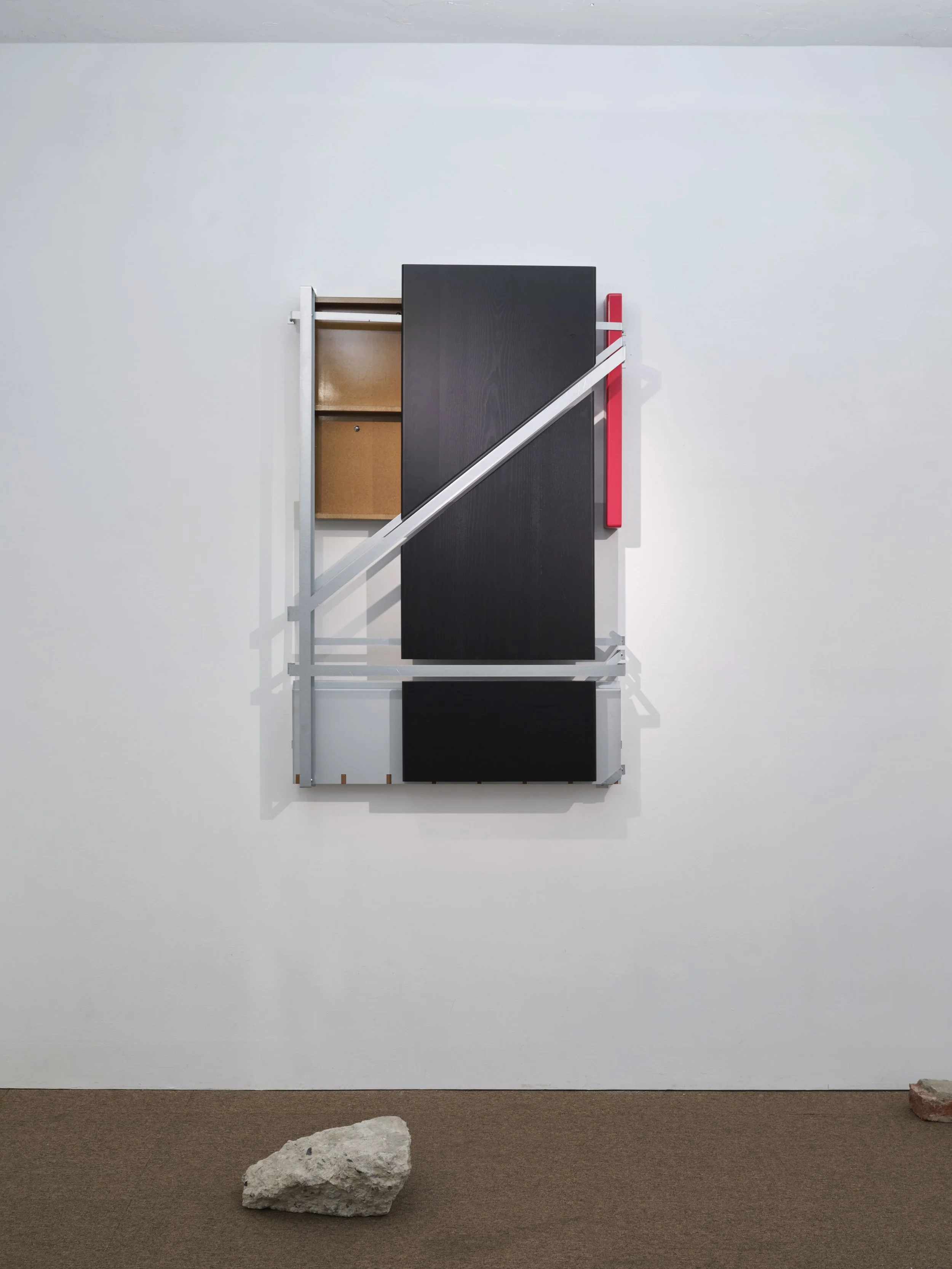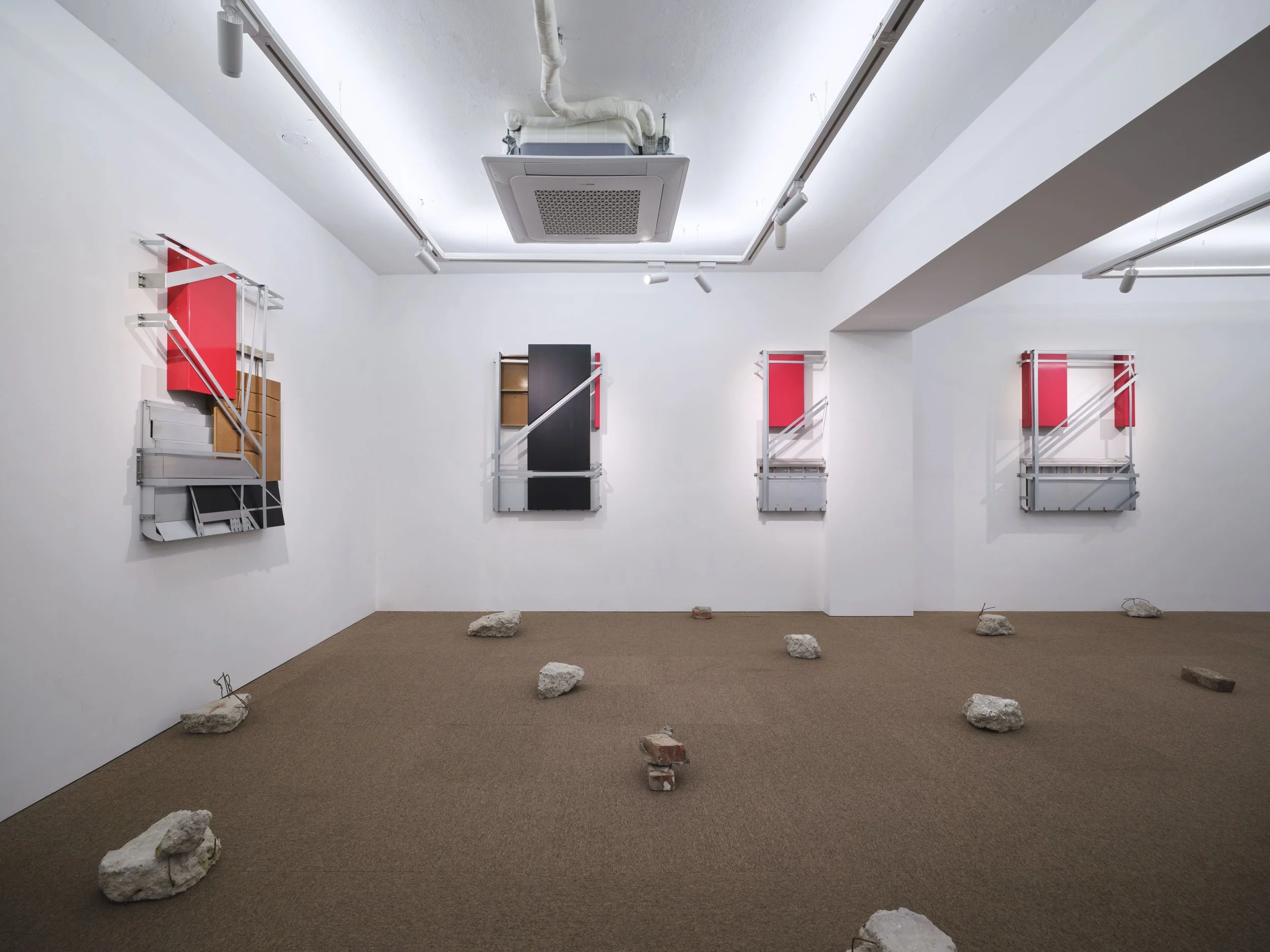 한편, 〈도킹즈〉가 이번 전시의 단일한 출발점이라고 볼 수는 없다. 그 또한 이전 작업 데이터 및 물리적인 파편들을 발췌, 재제작한 것이다. 등장하는 구조물은 다음을 포함한다: 《데코·데코 Décor·Décor: 리빙룸 아케이드》(일민미술관, 서울, 2022) 2층 시공을 위해 적채해둔 조립식 가벽, 버려진 공간을 전유하여 개방한 프로젝트 〈나열된 계층의 집〉(2014) 당시 조성한 무대의 모눈종이 패턴과 파쇄석이 깔린 바닥의 질감, 《다른 곳》(아뜰리에 에르메스, 서울 2020)에 출품한 〈시퀀스 타입: 3〉의 파츠 등. 이들은 이미 여러 차례 구축·해체·복각을 거치며 ‘원본’이라 부를 수 없는 상태에 이르렀다. 2010년대 초부터 주어진 환경에 개입하여 어떤 사건이 일어날만한 공간을 만드는 작업을 해오면서 축적된 데이터는 꼬리에 꼬리를 무는 자기 참조적 방법론에 안정적인 알리바이를 제공한다. 그의 궤적은 나아가 공간이란 살균된 흰 바탕이 아니라 누군가 쓰고, 지우고, 다시 쓰기를 반복해 온 흔적의 집적이라는 점과 공간을 만드는 일은 그 위에 임시로, 그리고 임의로 시뮬레이션 파일을 불러오기하는 일이라는 것을 상기한다. 이번 전시에서 처음으로 시도한 창문-부조는 이러한 그의 도면적 사고를 집악적으로 제시하며, 연쇄적으로 확장될 수 있는 재귀적 방법론의 시작을 알린다.